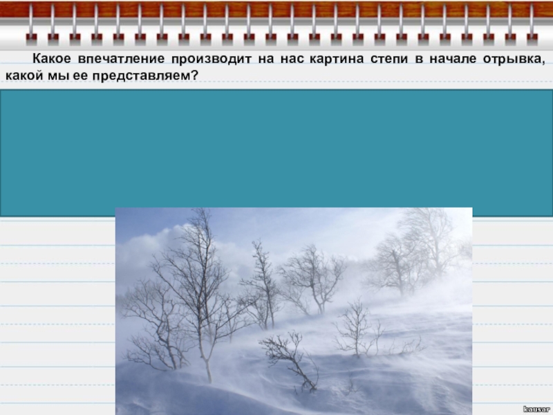 Огромная безмолвная равнина, кое-где холмы и овраги, все покрыто снегом; вечер, одинокая повозка. Картина производит унылое, грустное впечатление («простирались печальные равнины»), потому что не видно людей, ничего живого, только белый снег кругом.