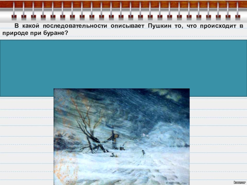 Последовательность временная. Сначала говорится о том, что происходит при его начале, и затем о том, что видели путники, когда буря была в разгаре. Рассказано про небо, ветер, снег в разные моменты: перед бурей, в начале ее и когда она разыгралась.