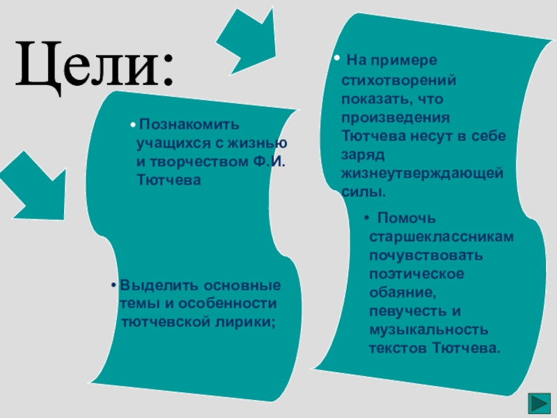 Помочь старшеклассникам почувствовать поэтическое обаяние, певучесть и музыкальность текстов Тютчева.
