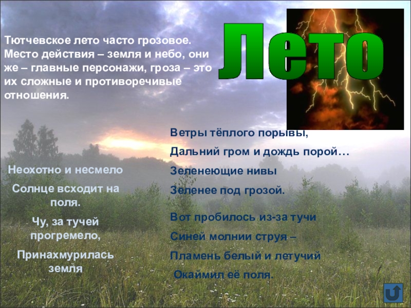 Тютчевское лето часто грозовое. Место действия – земля и небо, они же – главные персонажи, гроза – это их сложные и противоречивые отношения.