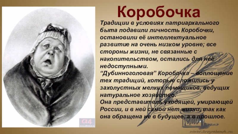 “Дубинноголовая” Коробочка – воплощение тех традиций, которые сложились у захолустных мелких помещиков, ведущих натуральное хозяйство.