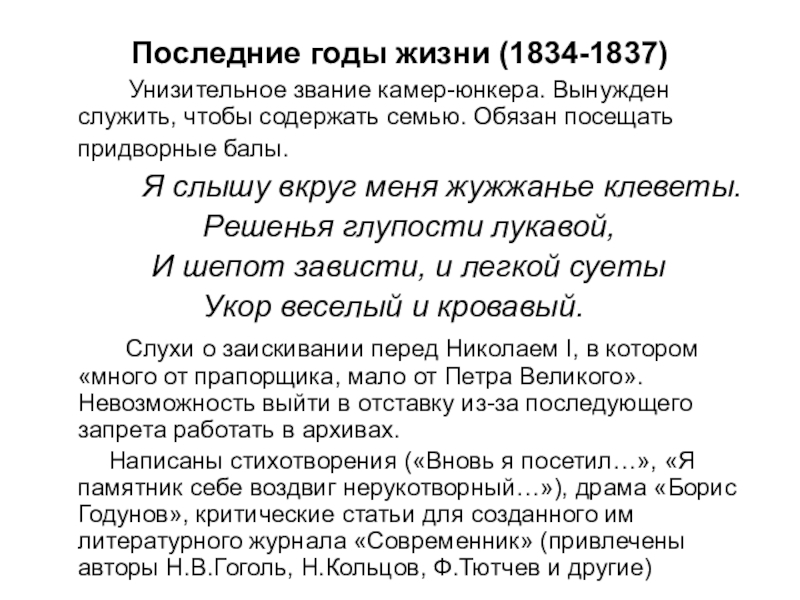 Слухи о заискивании перед Николаем I, в котором «много от прапорщика, мало от Петра Великого». Невозможность выйти в отставку из-за последующего запрета работать в архивах.