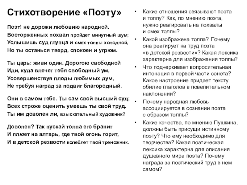 Какие качества, по мнению Пушкина, должны быть присущи истинному поэту? Что ему необходимо для творчества? Какая поэтическая лексика характерна для описания душевного мира поэта? Почему награда за поэтический труд в нем самом?