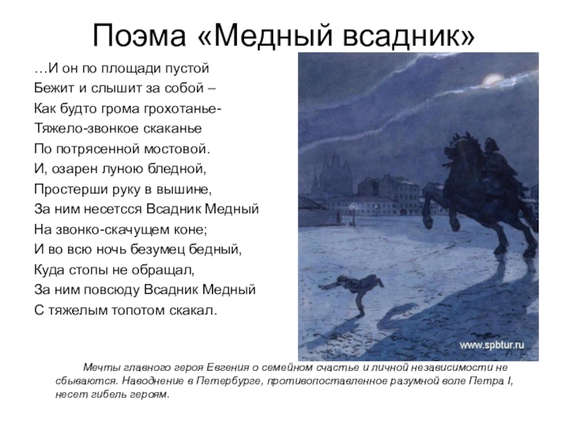 Мечты главного героя Евгения о семейном счастье и личной независимости не сбываются. Наводнение в Петербурге, противопоставленное разумной воле Петра I, несет гибель героям.