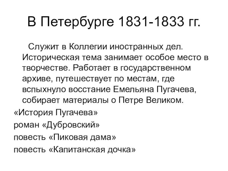 Историческая тема занимает особое место в творчестве. Работает в государственном архиве, путешествует по местам, где вспыхнуло восстание Емельяна Пугачева, собирает материалы о Петре Великом.