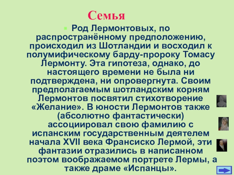 к полумифическому барду-пророку Томасу Лермонту. Эта гипотеза, однако, до настоящего времени не была ни подтверждена, ни опровергнута. Своим предполагаемым шотландским корням Лермонтов посвятил стихотворение «Желание». В юности Лермонтов также (абсолютно фантастически) ассоциировал свою фамилию с испанским государственным деятелем начала XVII века Франсиско Лермой, эти фантазии отразились в написанном поэтом воображаемом портрете Лермы, а также драме «Испанцы».