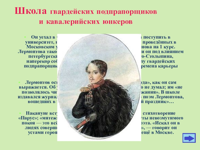 снова поступить в университет, но ему отказались засчитать два года, проведённых в Московском университете, предложив поступить снова на 1 курс. Лермонтова такое долгое студенчество не устраивало, и он под влиянием петербургских родственников, прежде всего Монго-Столыпина, наперекор собственным планам, поступает в Школу гвардейских подпрапорщиков и кавалерийских юнкеров. Эта перемена карьеры отвечала и желаниям бабушки.