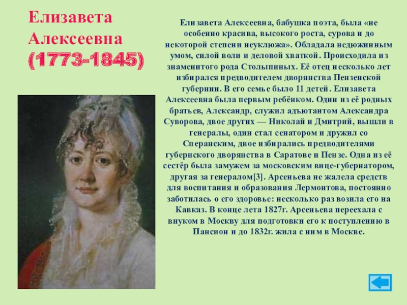роста, сурова и до некоторой степени неуклюжа». Обладала недюжинным умом, силой воли и деловой хваткой. Происходила из знаменитого рода Столыпиных. Её отец несколько лет избирался предводителем дворянства Пензенской губернии. В его семье было 11 детей. Елизавета Алексеевна была первым ребёнком. Один из её родных братьев, Александр, служил адъютантом Александра Суворова, двое других — Николай и Дмитрий, вышли в генералы, один стал сенатором и дружил со Сперанским, двое избирались предводителями губернского дворянства в Саратове и Пензе. Одна из её сестёр была замужем за московским вице-губернатором, другая за генералом[3]. Арсеньева не жалела средств для воспитания и образования Лермонтова, постоянно заботилась о его здоровье: несколько раз возила его на Кавказ. В конце лета 1827г. Арсеньева переехала с внуком в Москву для подготовки его к поступлению в Пансион и до 1832г. жила с ним в Москве.