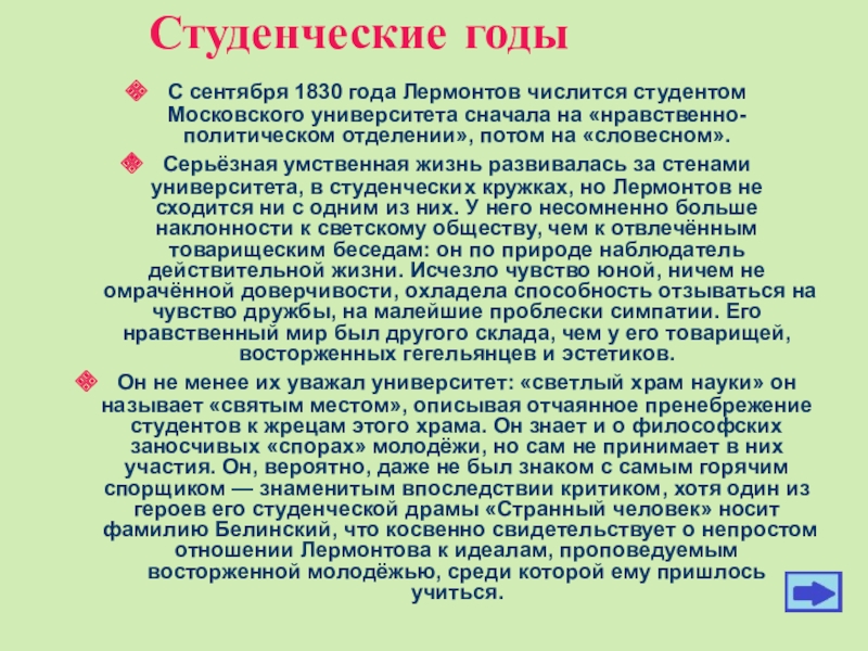 Он не менее их уважал университет: «светлый храм науки» он называет «святым местом», описывая отчаянное пренебрежение студентов к жрецам этого храма. Он знает и о философских заносчивых «спорах» молодёжи, но сам не принимает в них участия. Он, вероятно, даже не был знаком с самым горячим спорщиком — знаменитым впоследствии критиком, хотя один из героев его студенческой драмы «Странный человек» носит фамилию Белинский, что косвенно свидетельствует о непростом отношении Лермонтова к идеалам, проповедуемым восторженной молодёжью, среди которой ему пришлось учиться.