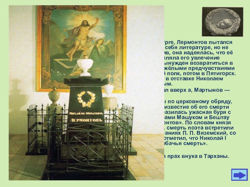 Спустя несколько месяцев Арсеньева перевезла прах внука в Тарханы.