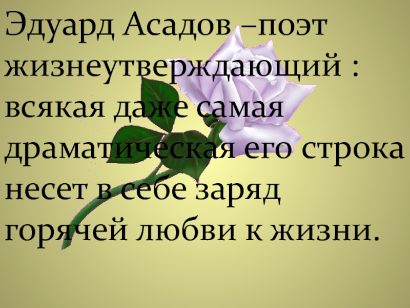 Слайд 20Эдуард Асадов –поэт жизнеутверждающий : всякая даже самая драматическая его строка