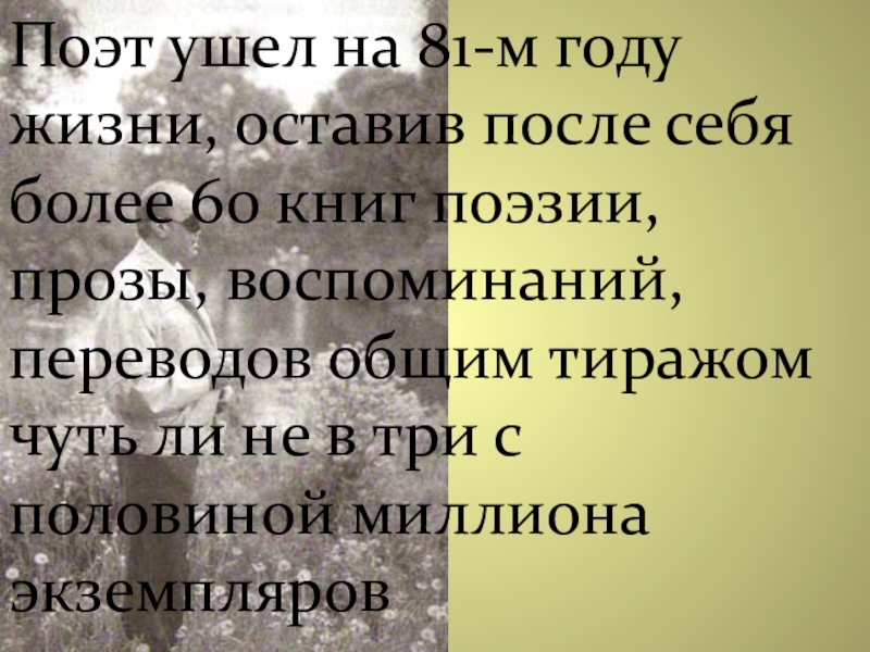 Слайд 13Поэт ушел на 81-м году жизни, оставив после себя более 60