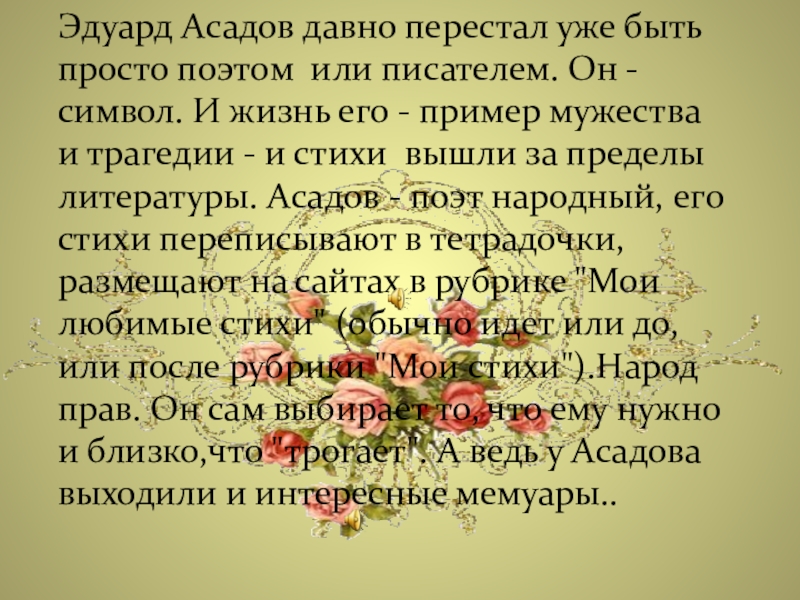 Слайд 12Эдуард Асадов давно перестал уже быть просто поэтом или писателем. Он