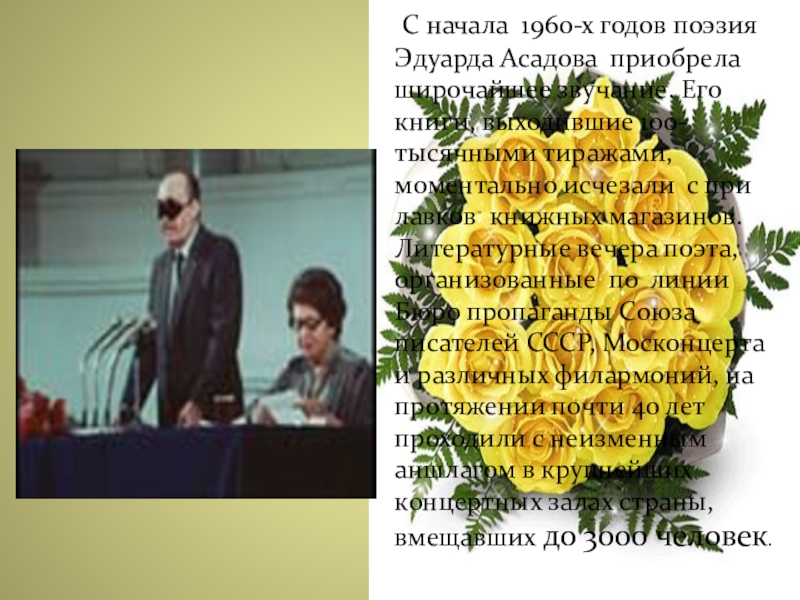 Слайд 6 С начала 1960-х годов поэзия Эдуарда Асадова приобрела широчайшее звучание. Его