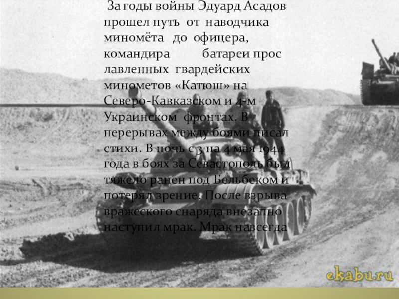 Слайд 4 За годы войны Эдуард Асадов прошел путь от наводчика миномёта