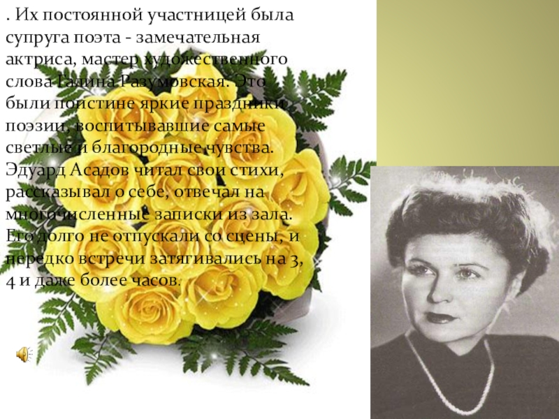 художественного слова Галина Разумовская. Это были поистине яркие праздники поэзии, воспитывавшие самые светлые и благородные чувства. Эдуард Асадов читал свои стихи, рассказывал о себе, отвечал на многочисленные записки из зала. Его долго не отпускали со сцены, и нередко встречи затягивались на 3, 4 и даже более часов.