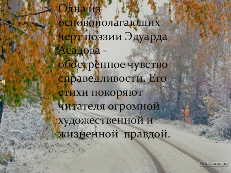 Слайд 18Одна из основополагающих черт поэзии Эдуарда Асадова - обостренное чувство справедливости.