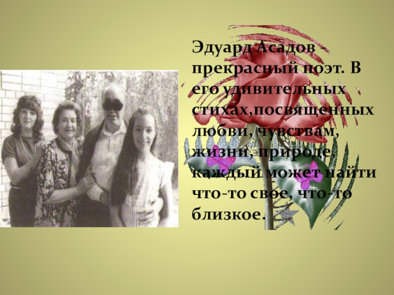Слайд 23Эдуард Асадов - прекрасный поэт. В его удивительных стихах,посвященных любви, чувствам,