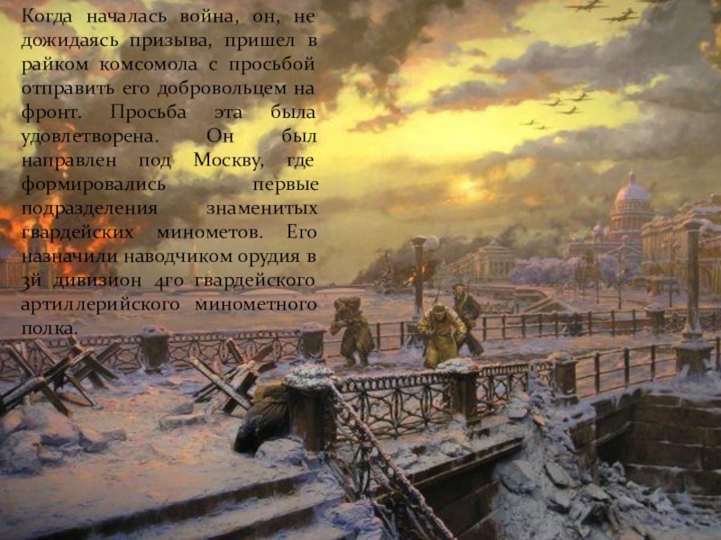 Слайд 3Когда началась война, он, не дожидаясь призыва, пришел в райком комсомола