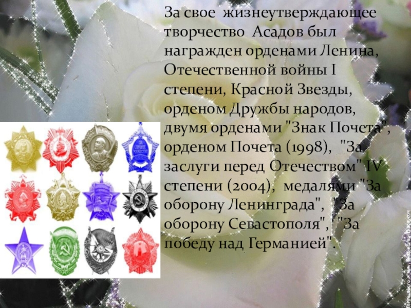 Слайд 16За свое жизнеутверждающее творчество Асадов был награжден орденами Ленина, Отечественной войны