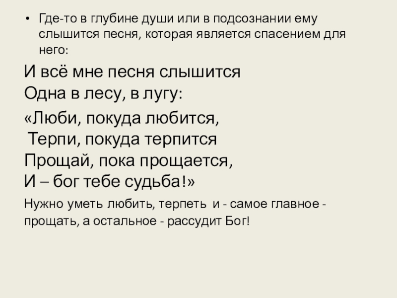 Слайд 23Где-то в глубине души или в подсознании ему слышится песня, которая