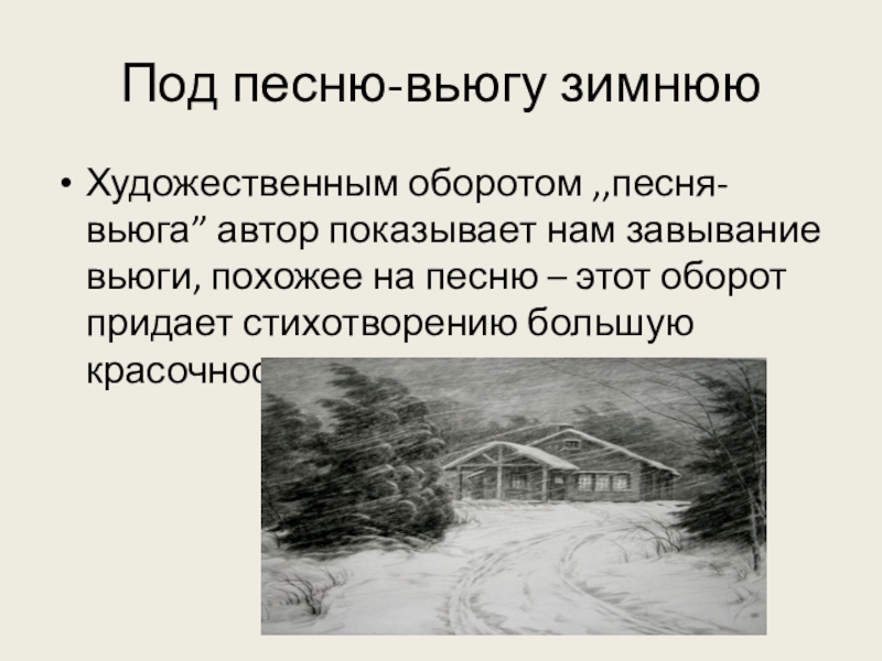 Художественным оборотом ,,песня-вьюга” автор показывает нам завывание вьюги, похожее