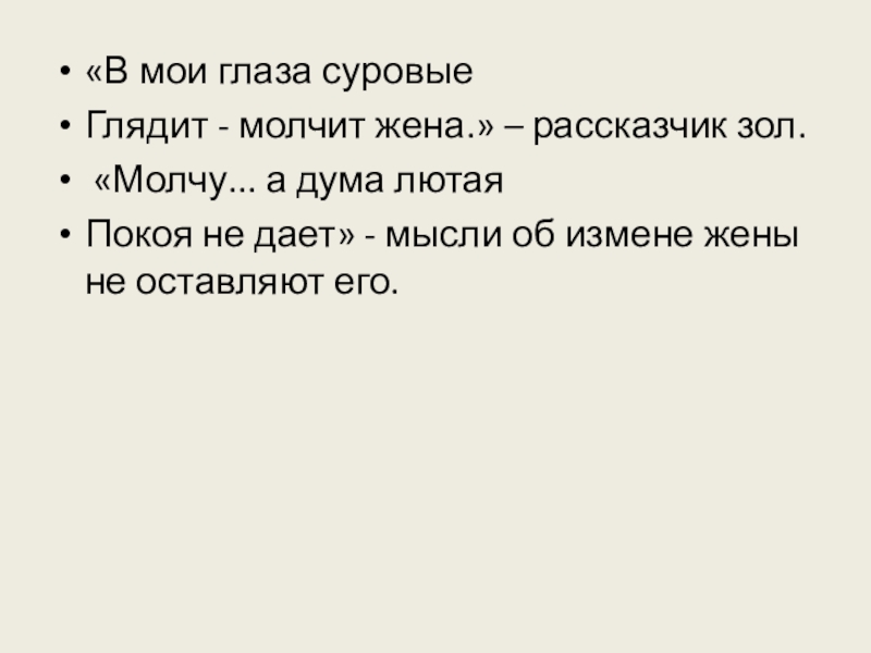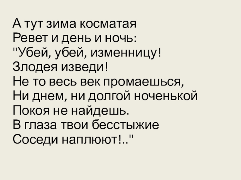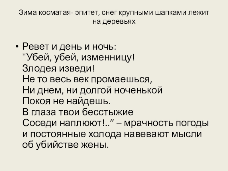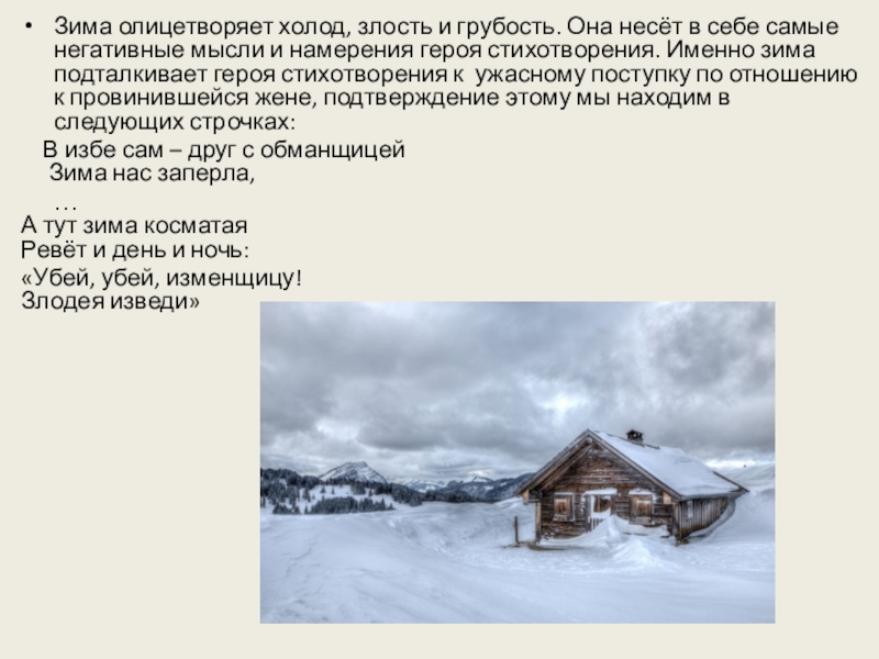 негативные мысли и намерения героя стихотворения. Именно зима подталкивает героя стихотворения к ужасному поступку по отношению к провинившейся жене, подтверждение этому мы находим в следующих строчках: