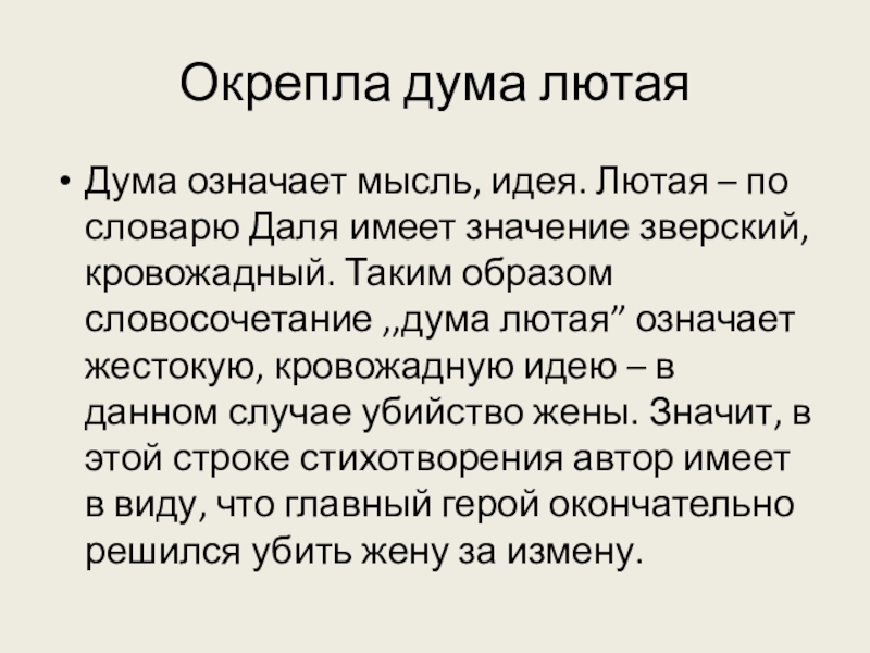Даля имеет значение зверский, кровожадный. Таким образом словосочетание ,,дума лютая” означает жестокую, кровожадную идею – в данном случае убийство жены. Значит, в этой строке стихотворения автор имеет в виду, что главный герой окончательно решился убить жену за измену.