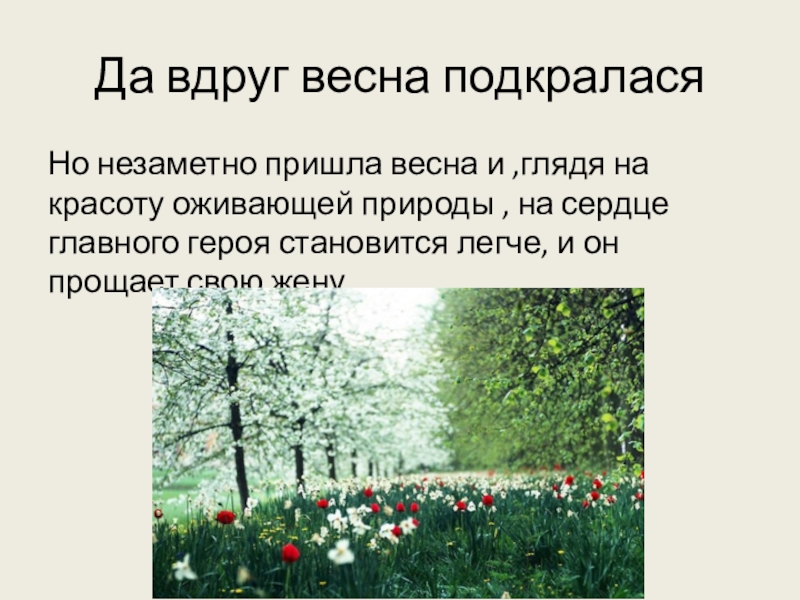 красоту оживающей природы , на сердце главного героя становится легче, и он прощает свою жену.