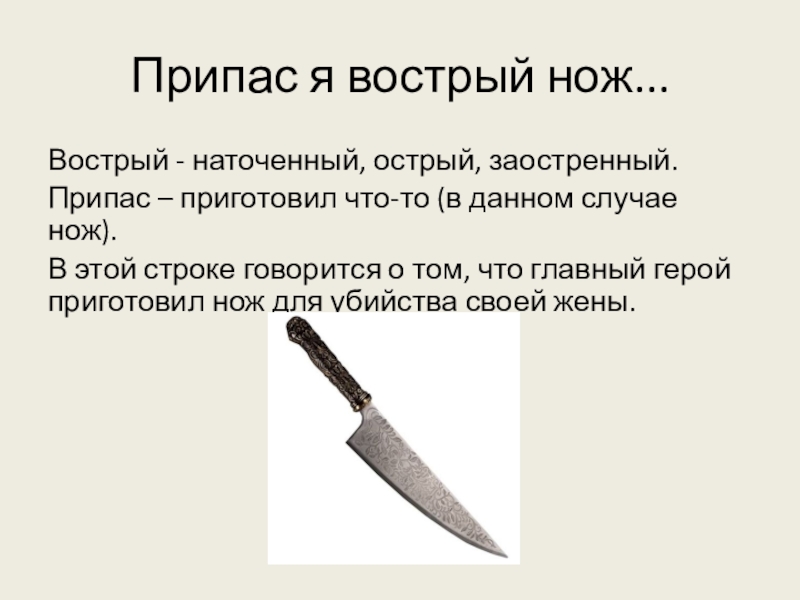 В этой строке говорится о том, что главный герой приготовил нож для убийства своей жены.