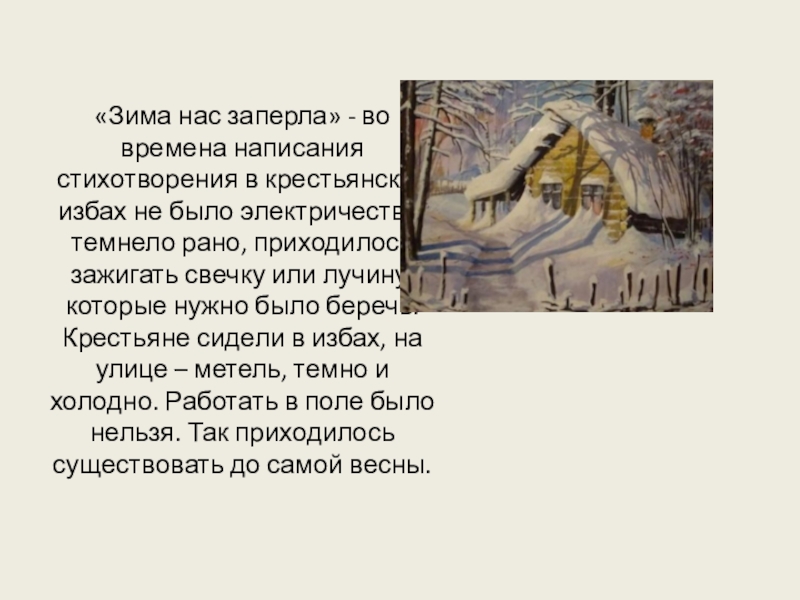 Слайд 8«Зима нас заперла» - во времена написания стихотворения в крестьянских избах