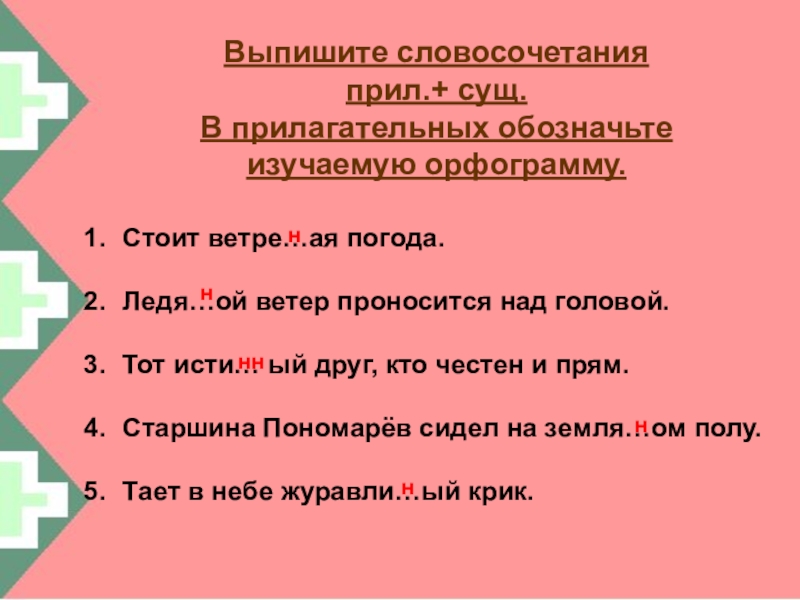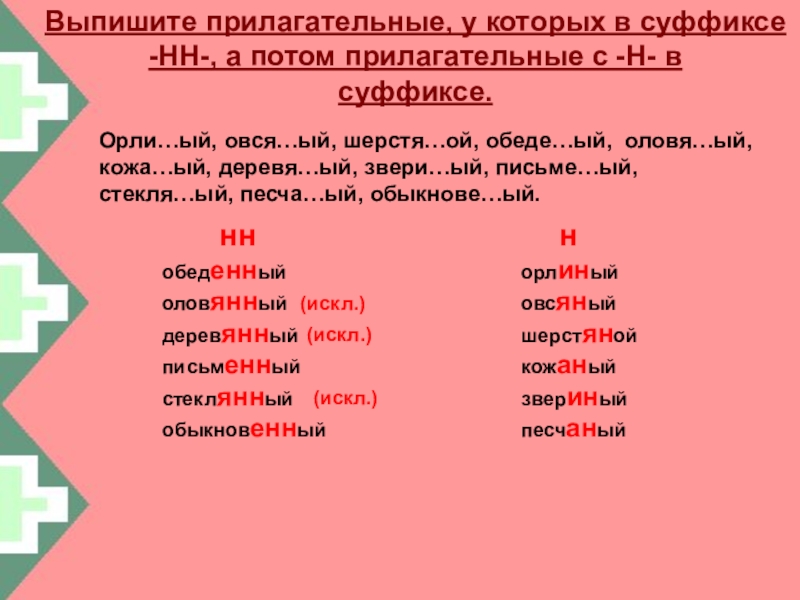 Орли…ый, овся…ый, шерстя…ой, обеде…ый, оловя…ый, кожа…ый, деревя…ый, звери…ый, письме…ый, стекля…ый, песча…ый, обыкнове…ый.