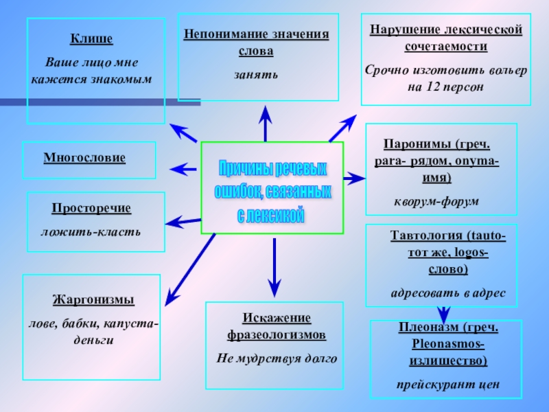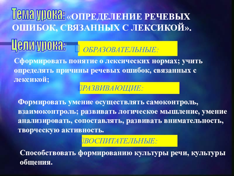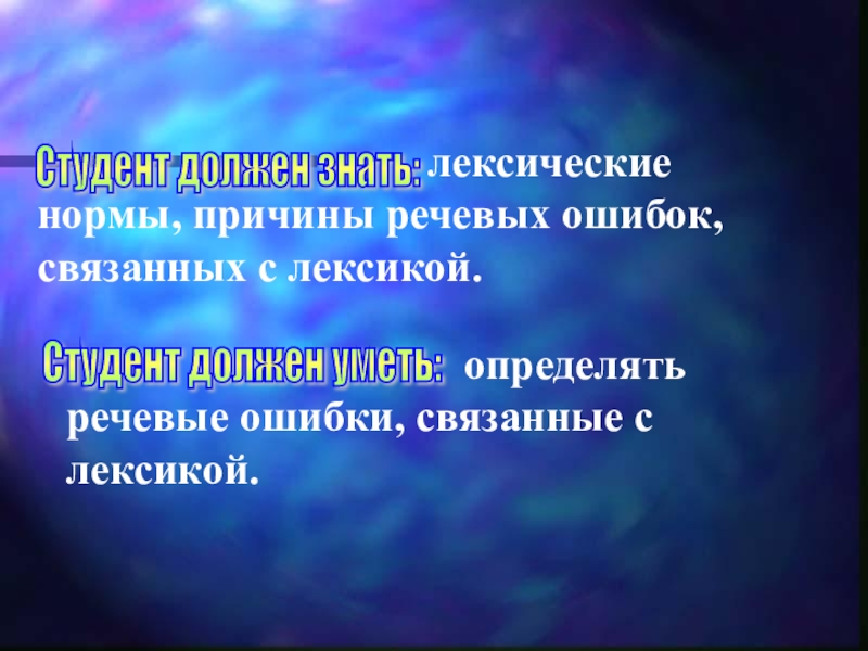 Сформировать понятие о лексических нормах; учить определять причины речевых ошибок, связанных с лексикой;