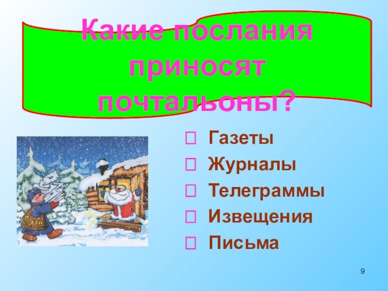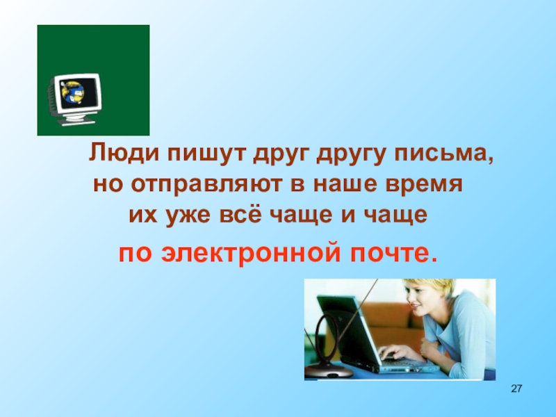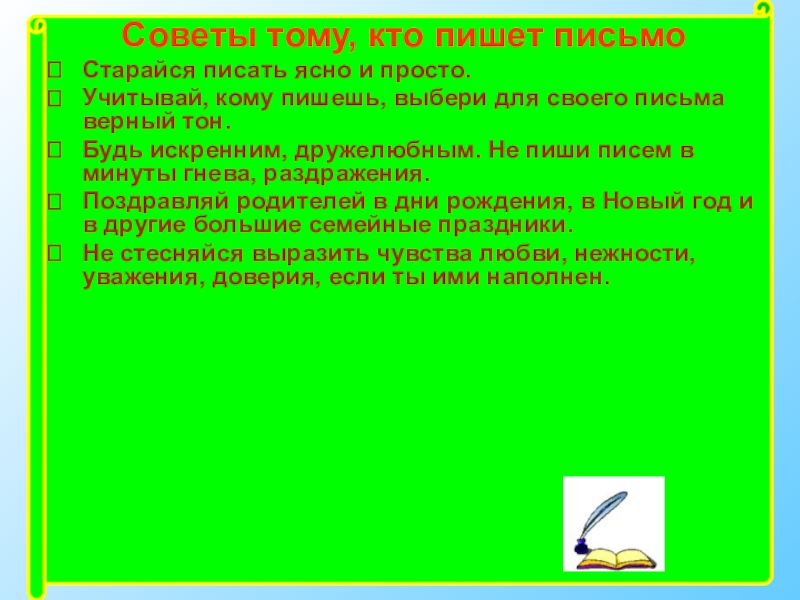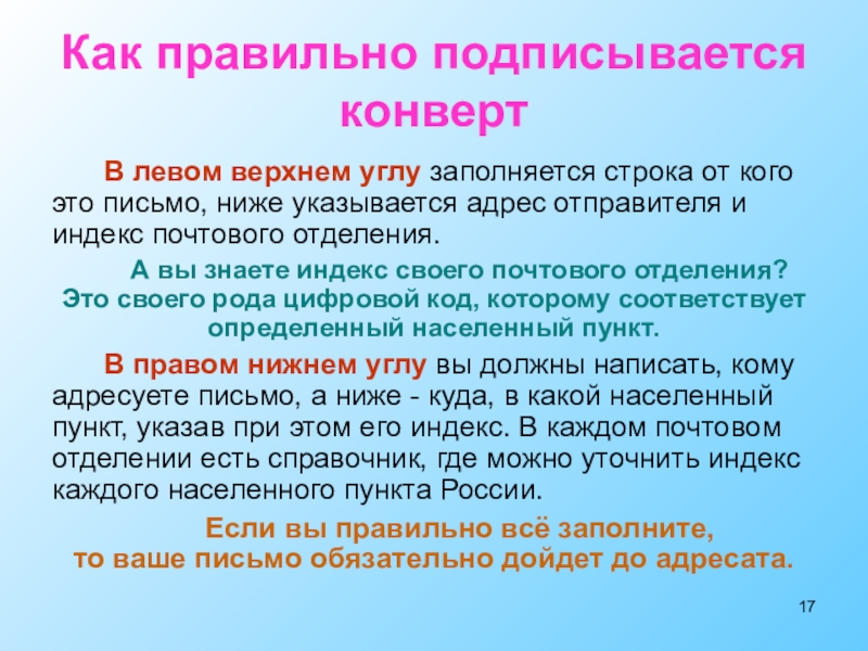 Почта связывает нашу страну со всем миром. Так давайте же писать друг другу письма! Получив их, адресат улыбнется, а каждая улыбка - это лучик нашего солнца.