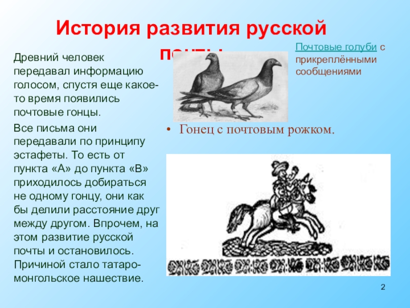 Все письма они передавали по принципу эстафеты. То есть от пункта «А» до пункта «B» приходилось добираться не одному гонцу, они как бы делили расстояние друг между другом. Впрочем, на этом развитие русской почты и остановилось. Причиной стало татаро-монгольское нашествие.