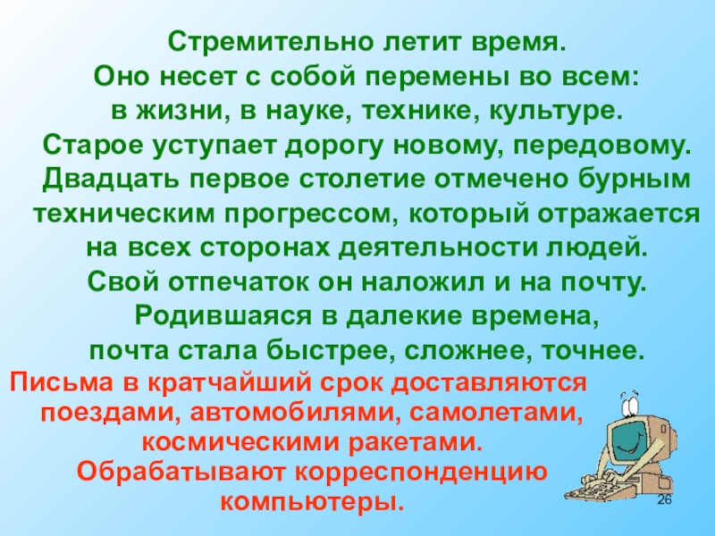 Двадцать первое столетие отмечено бурным техническим прогрессом, который отражается на всех сторонах деятельности людей. Свой отпечаток он наложил и на почту. Родившаяся в далекие времена, почта стала быстрее, сложнее, точнее.
