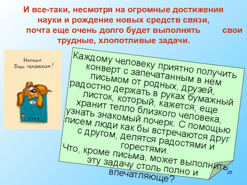 Каждому человеку приятно получить конверт с запечатанным в нем письмом от родных, друзей, радостно держать в руках бумажный листок, который, кажется, еще хранит тепло близкого человека, узнать знакомый почерк. С помощью писем люди как бы встречаются друг с другом, делятся радостями и горестями. Что, кроме письма, может выполнить эту задачу столь полно и впечатляюще?