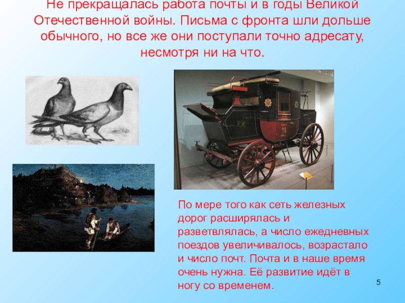 По мере того как сеть железных дорог расширялась и разветвлялась, а число ежедневных поездов увеличивалось, возрастало и число почт. Почта и в наше время очень нужна. Её развитие идёт в ногу со временем.