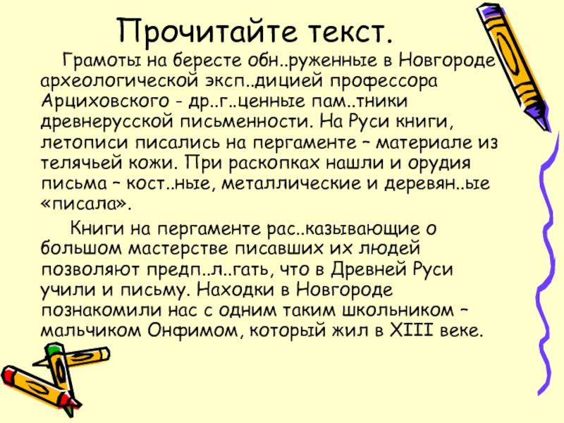 Новгороде археологической эксп..дицией профессора Арциховского - др..г..ценные пам..тники древнерусской письменности. На Руси книги, летописи писались на пергаменте – материале из телячьей кожи. При раскопках нашли и орудия письма – кост..ные, металлические и деревян..ые «писала».
