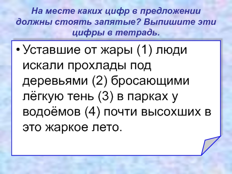 Уставшие от жары (1) люди искали прохлады под деревьями (2) бросающими лёгкую тень (3) в парках у водоёмов (4) почти высохших в это жаркое лето.