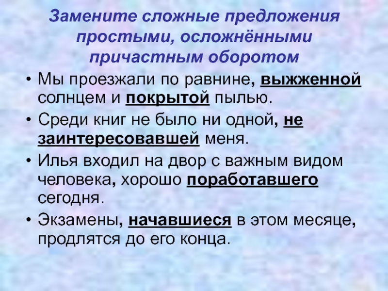 Слайд 21Замените сложные предложения простыми, осложнёнными причастным оборотом