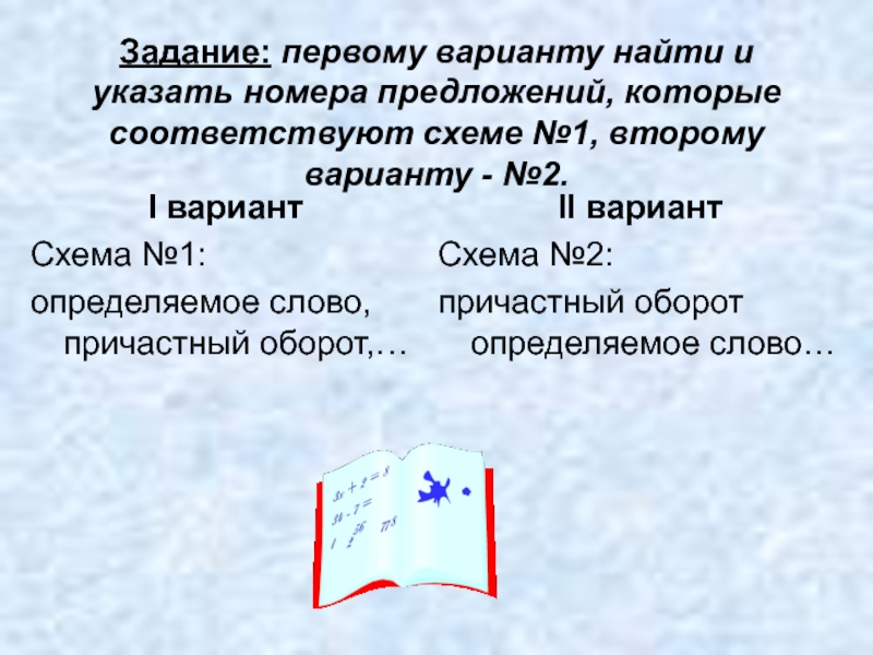 Слайд 13Задание: первому варианту найти и указать номера предложений, которые соответствуют схеме