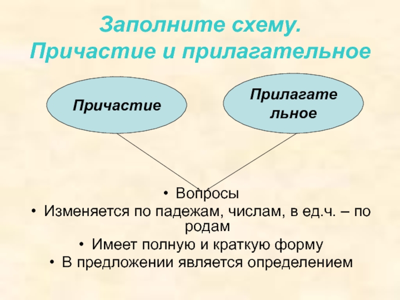 Причастия изменяются по родам…………………………….., как и ………………… .