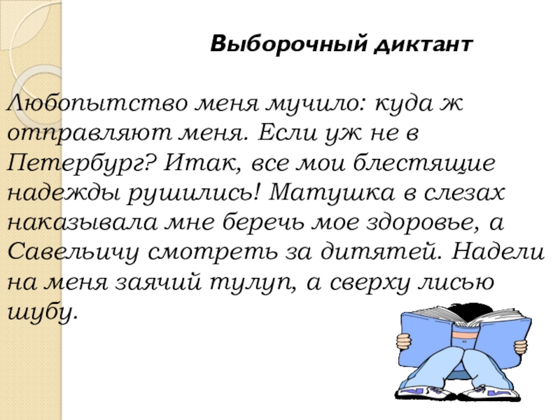 Любопытство меня мучило: куда ж отправляют меня. Если уж не в Петербург? Итак, все мои блестящие надежды рушились! Матушка в слезах наказывала мне беречь мое здоровье, а Савельичу смотреть за дитятей. Надели на меня заячий тулуп, а сверху лисью шубу.