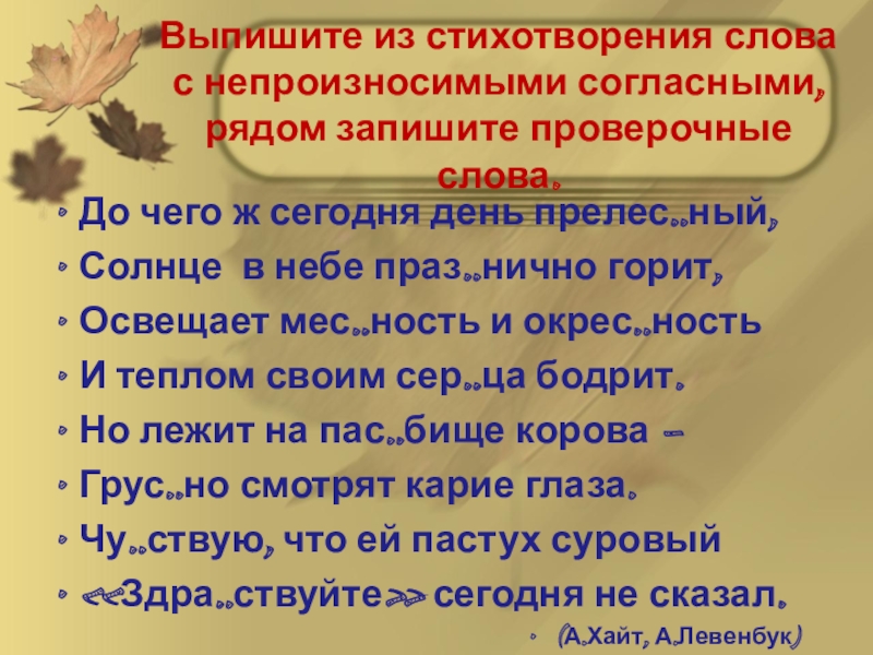 Слайд 9Выпишите из стихотворения слова с непроизносимыми согласными, рядом запишите проверочные слова.