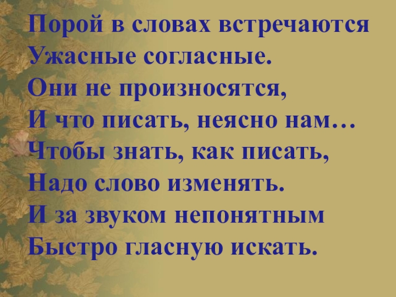 Порой в словах встречаютсяУжасные согласные.Они не произносятся, И что писать, неясно нам…Чтобы знать, как писать,Надо слово изменять.И