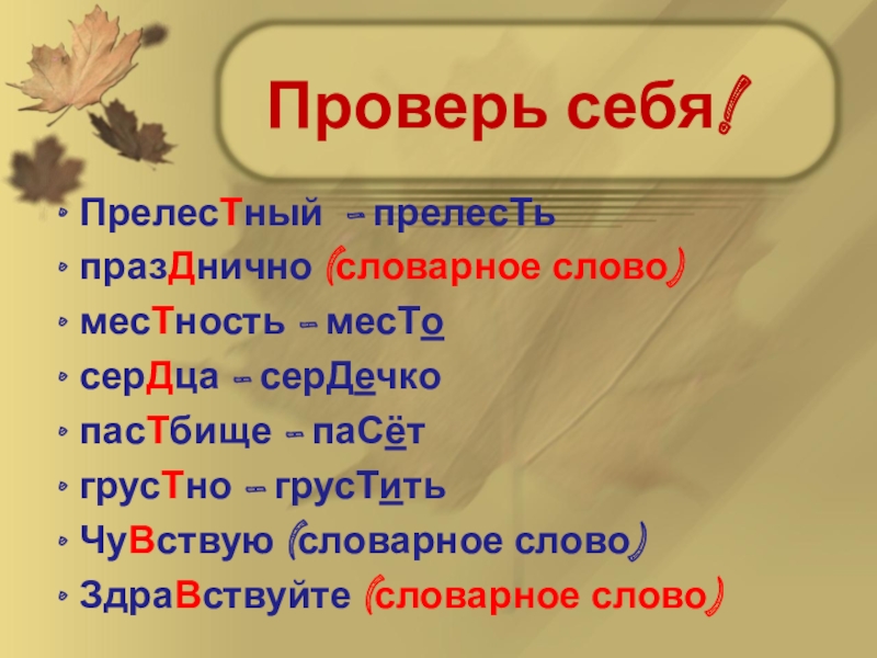 Проверь себя!ПрелесТный - прелесТьпразДнично (словарное слово)месТность - месТосерДца - серДечкопасТбище - паСёт грусТно – грусТитьЧуВствую (словарное слово)ЗдраВствуйте