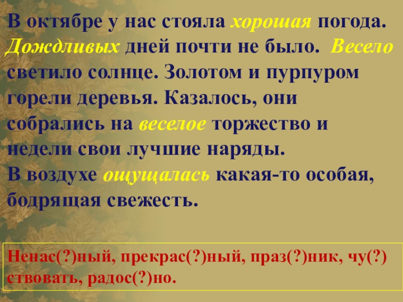 Ненас(?)ный, прекрас(?)ный, праз(?)ник, чу(?)ствовать, радос(?)но. В октябре у нас стояла хорошая погода. Дождливых дней почти не было.
