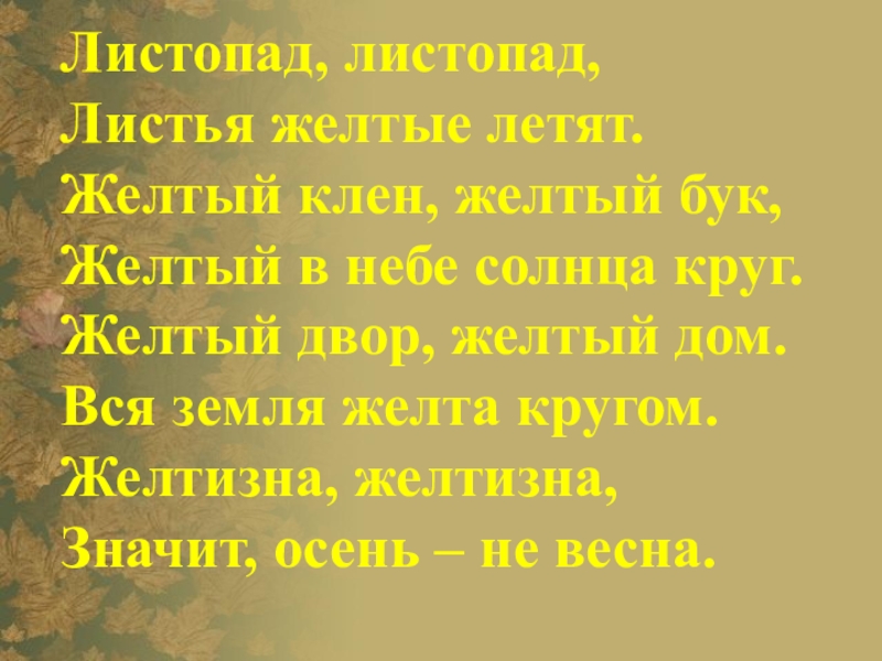 Листопад, листопад,Листья желтые летят.Желтый клен, желтый бук,Желтый в небе солнца круг.Желтый двор, желтый дом.Вся земля желта кругом.Желтизна, желтизна,Значит, осень – не весна.