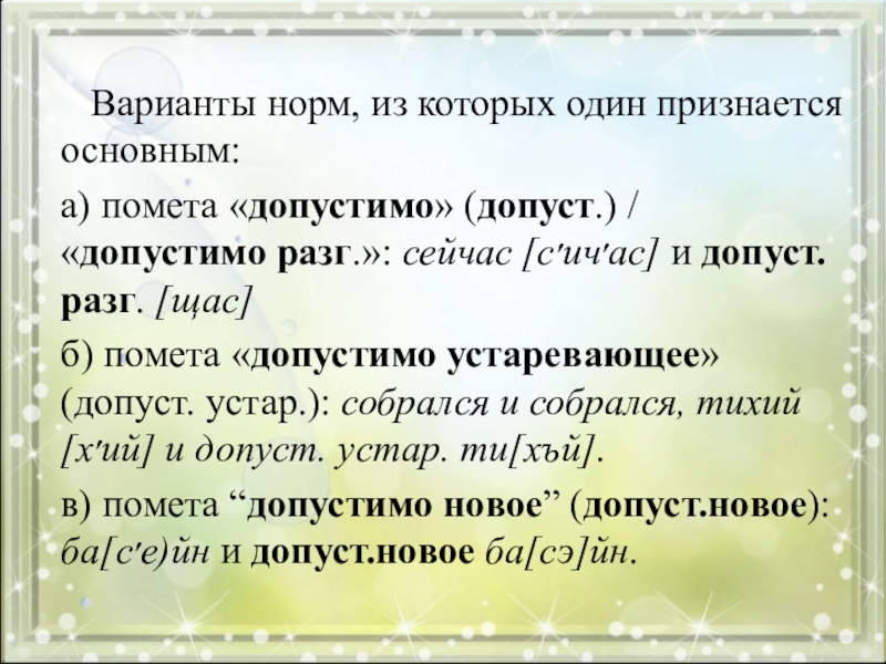 б) помета «допустимо устаревающее» (допуст. устар.): собрался и собрался, тихий [х׳ий] и допуст. устар. ти[хъй].